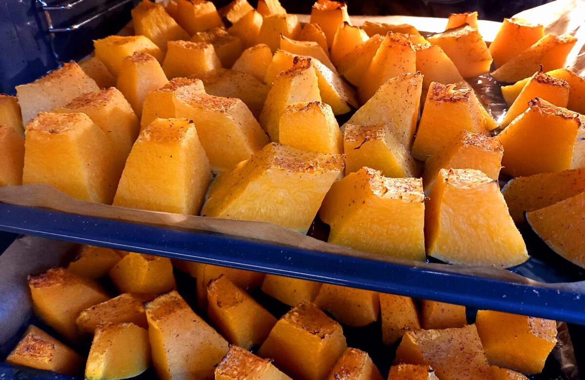 Nastawiam piekarnik na ok. 190-200°, na 30 minut. W międzyczasie myję dynie, kroje na mniejsze kawałki i układam na blaszkę, skórkami do dołu. Nie przykładam uwagi do kształtu kawałków ani ich wielkości, gdyż później i tak ściągam z nich skórkę, a dynię rozgniatam widelcem. Dynia jest gotowa, gdy jest po prostu miękka co sprawdzam widelcem raz na jakiś czas. Po upieczeniu zostawiam ją na noc aby zupełnie ostygła i aby pozbyć się ewentualnego nadmiaru wody.