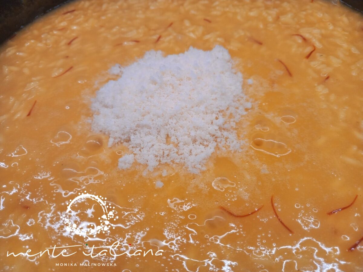 Następnie – już po wyłączeniu ognia – dodajemy masło i Grana Padano. Całość dokładnie mieszamy. Zostawiamy risotto pod przykryciem na 5 minut.