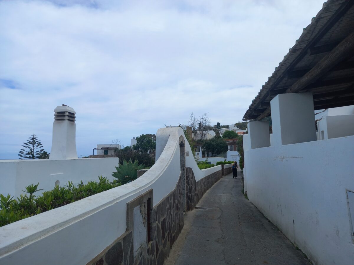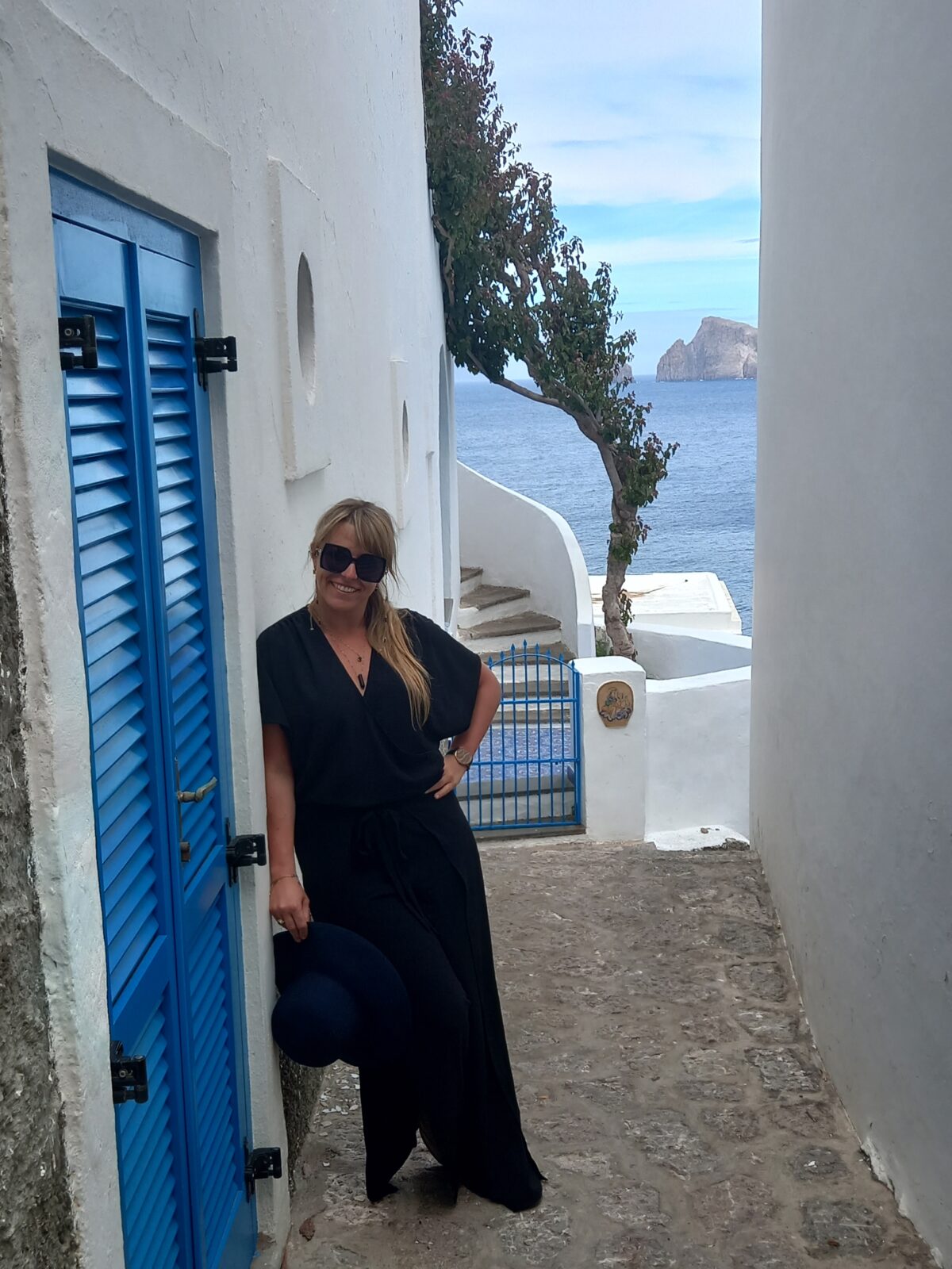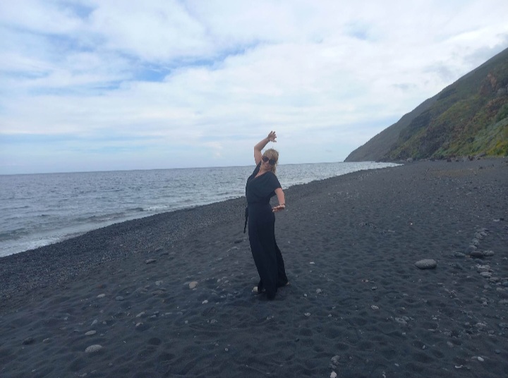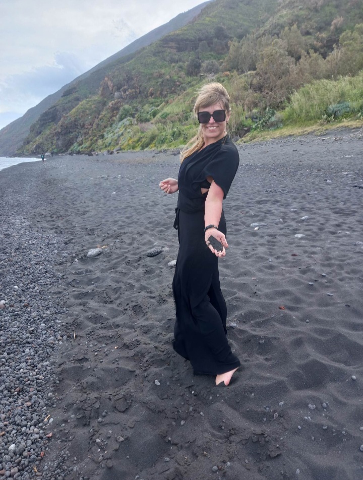 Po zejściu ze statku skierowałyśmy swoje kroki na plażę. Spacer na boska po pustej, czarnej plaży był jednym z najbardziej niecodziennych i wyjątkowych spacerów w moim życiu. Czarny piasek, zielono-czarne zbocza, popołudniowe niebo delikatnie zachmurzone, kilka białych domków i dym wydobywający się z krateru. To wszystko sprawiło, że miałyśmy wrażenie, że znajdujemy w zupełnie innej czasoprzestrzeni. Nie we Włoszech, ale gdzieś na końcu świata, gdzieś naprawdę daleko. Po krótkim pikniku i małej sesji zdjęciowej już w butach kontynuowałyśmy zwiedzanie. Najpierw wzdłuż wybrzeża by dotrzeć do centrum miejscowości San Vincenzo. Podziwiałyśmy architekturę typową dla budownictwa na Wyspach Eolskich, z zachowanymi kopułami pieców, cysternami, prasami do tłoczenia wina, bielonymi domami i tarasami tworzącymi niesamowity klimat. Chciałyśmy poczuć ten klimat i zatrzymałyśmy się w jednej z lokalnej restauracji, z ogromnym tarasem i wspaniałym widokiem na okolicę i na morze. Jedząc pyszną pizzę, popijając spritza cieszyłyśmy się wakacjami.