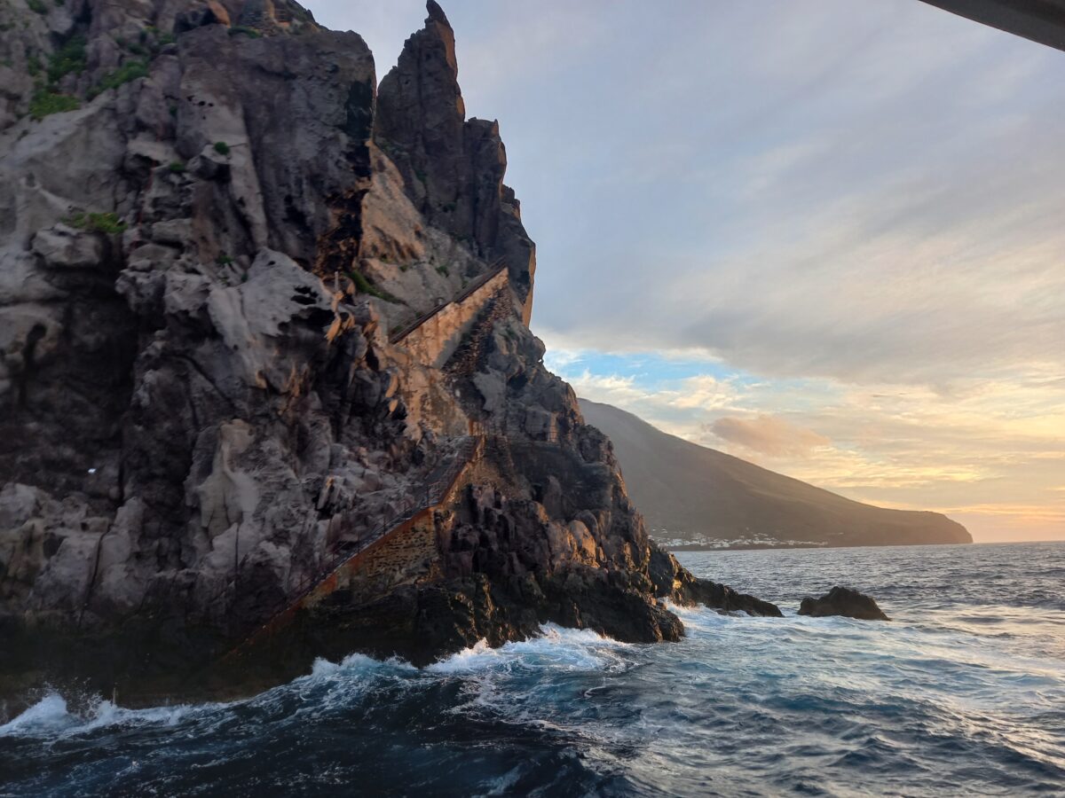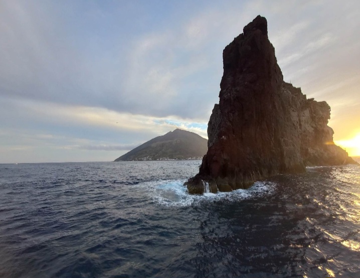 Zbliżał się wieczór, nadeszła pora opuszczenia tej wyjątkowej wyspy. Nie był to jednak jeszcze koniec naszej wycieczki. Ze statku obserwowałyśmy przepiękny zachód słońca. Opłynęliśmy Strombolicchio, samotną skałę znajdującą się 2 km od Stromboli, na której znajduje się latarnia morska [jakim cudem się tam znalazła? Jak ją tam zbudowano. Nie mam pojęcia]. Podpłynęliśmy w kierunku Sciara del Fuoco zbocza/drogi po której spływa żarząca się lawa schodząc do morza. Kiedy się ściemniło statek zatrzymał się i wszyscy pasażerowie zamarli w oczekiwaniu, wszyscy zwrócili swoje oczy ku górze, w kierunku krateru. Aż w końcu Stromboli dał o sobie znać wyrzucając z siebie materiał piroklastyczny. I chociaż wybuchy nie były tak spektakularne jak w grudniu 2022 [na całe szczęście], to pojawiające się języki ognia wzbudziły we wszystkich niemałą euforię.