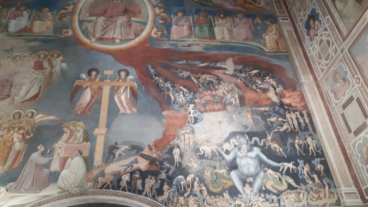 Wszyscy, absolutnie wszyscy Włosi których znam mówili mi, że można nie zwiedzać samego miasta, można nie napić się spritza w najbardziej znanym z tego napoju miejscu w kraju, ale jedno miejsce zobaczyć trzeba. Jest nią kaplica Scrovegni di Giotto, najważniejszy cykl malarski/obrazów na świecie. Nie jest to jednak takie oczywiste, bo stojąc na zewnątrz można pomyśleć, że nie znajduje się tam nic wyjątkowego, żeby było warte wchodzenia do środka. Nic bardziej mylnego. … zachwycające jest gwieździste niebo pod którym znajdowałyśmy się my i znajdują się epizody z życia biblijnych postaci. Zaskakujący, a wręcz szokujący jest fakt, że wykonanie tak niesamowitego dzieła zajęło Giotto jedynie niecałe dwa lata!!! W 1303 roku Giotto otrzymał zamówienie od Enrico Scrovegni a w 1305 prace były już zakończone. Jako ciekawostka Enrico zlecił budowę kaplicy ku odkupieniu win swojego ojca Reginaldo Scrovegni, który nie miał w mieście dobrej sławy. Giotto i jego dzieło zapoczątkowały owego czasu swoistą rewolucję w malarstwie. Każdy z użytych kolorów miał swoją symbo likę, a postacie nigdy wcześniej nie były tak realne. Na jednym z fresków widnieje pierwszy w historii namalowany pocałunek [był to małżeński pocałunek].