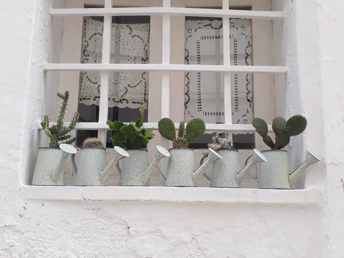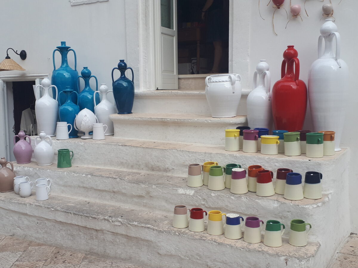 Jadąc z okolic Martina Franca w kierunku białego miasta przejechałyśmy właściwie przez całą dolinę d’Itria. W drodze do Locorotondo napotkałyśmy naszego sympatycznego osiołka. Samo miasteczko zaś zostało wpisane na włoską listę tych najpiękniejszych w Italii. Od samego przekroczenia bramy białe miasteczko nas oczaruje. Zagubmy się w labiryncie wąskich uliczek i po prostu zachwycajmy. Na każdym kroku, przy każdym wejściu to domu, na każdym kroku morze kolorowych kwiatów i roślin, które wyglądają bajecznie na tle białych murów. Do tego urokliwe kawiarenki i przepiękna lokalna ceramika. Jest tam kilka kościołów, nie ma natomiast miejsc, zabytków o ważniejszym znaczeniu historyczno-kulturowym, a mimo po zwiedzeniu kilkunastu lub kilkudziesięciu miasteczek podczas pobytu w  Puglii, Locorotondo pozostaje w mojej pamięci jako jedne z najpiękniejszych i najbardziej wartych odwiedzenia. Na pewno tam jeszcze wrócę.