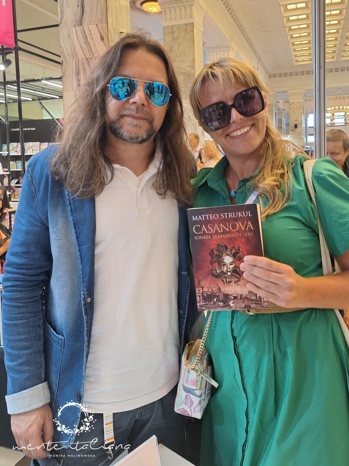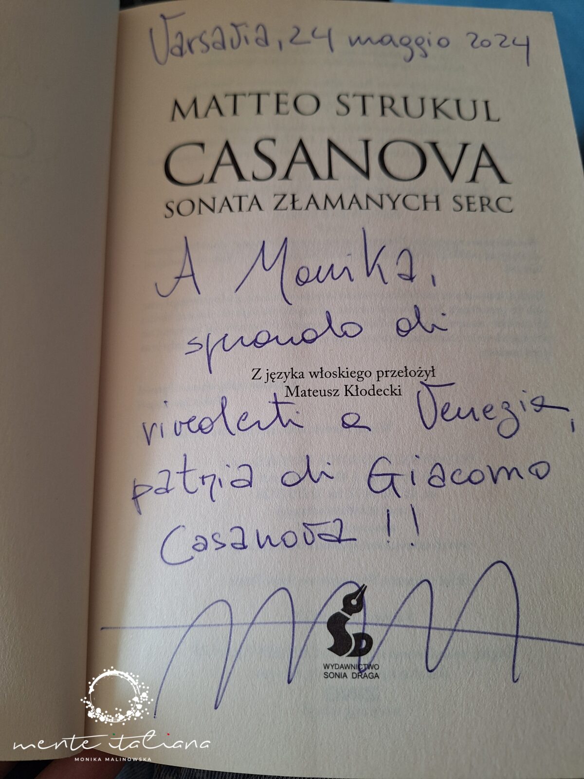 Tego samego dnia odbyła się rozmowa z jednym z moich ulubionych włoskich autorów, z Matteo Strukulem. Jest on autorem znanych i cenionych powieści historycznych. Do jego najsłynniejszych książek należy saga florenckiej dynastii Medyceuszy. Jak wspomina sam autor historia Włoch to historia rodzin oraz miast w których żyli i którymi rządzili. Matteo przyjechał do Warszawy z żoną z Padwy. Rozmawialiśmy już prywatnie o Wenecji, którą oboje bardzo lubimy, a która jest miastem Casanovy o którym również piszę autor. Na koniec otrzymałam autograf, który jest miła pamiątką z pobytu w Warszawie.