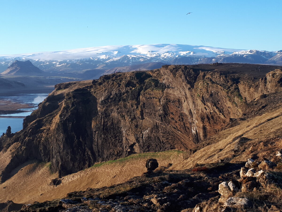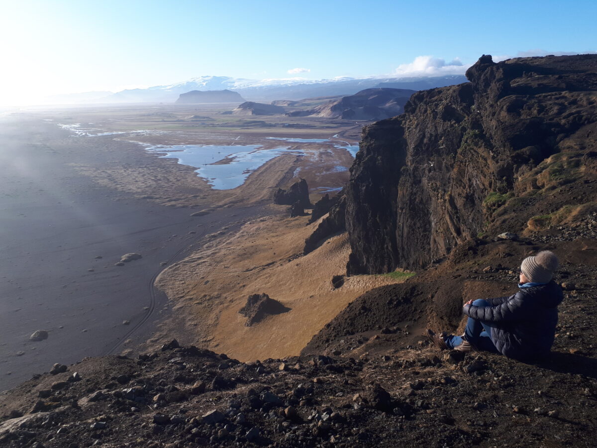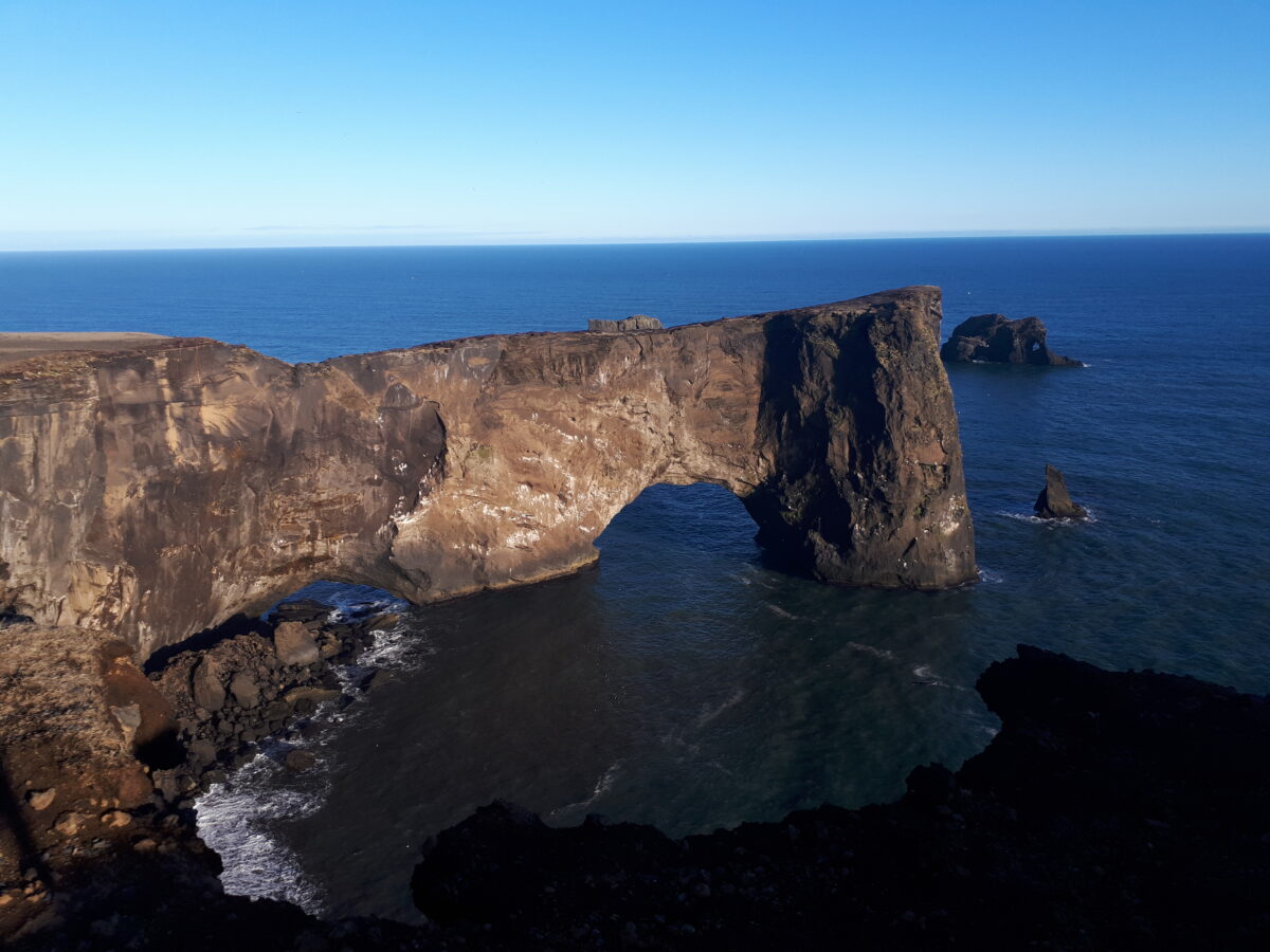 Widoki ze szczytu klifu Dyrhólaey, znajdującego się ok. 200 km na wschód od stolicy Islandii, są przepiękne. Bez względu na to, w którym kierunku spoglądamy jest po prostu przepięknie. Na południu znajduje się morze, na wschodzie czarna plaża Reynisfjara i skały Reynisdrangar , na północy znajduje się lodowiec Mýrdalsjökull i Eyjafjallajökull, a na zachodzie są czarne piaski Sólheimasandur. Wybraliśmy się tam pod koniec kwietnia, mieliśmy tego dnia wyjątkowe szczęście; było słonecznie i bezwietrznie. Wymarzona pogoda i widoczność. Miejsce mnie zachwyciło. Jakby wrażeń było mało, to zobaczyłam na własne oczy prawdziwego wieloryba. Niesamowita sprawa, zupełnie się tego nie spodziewałam. Nie jestem w stanie opisać jak ogromna była moja radość!! Prawdziwy wieloryb!!