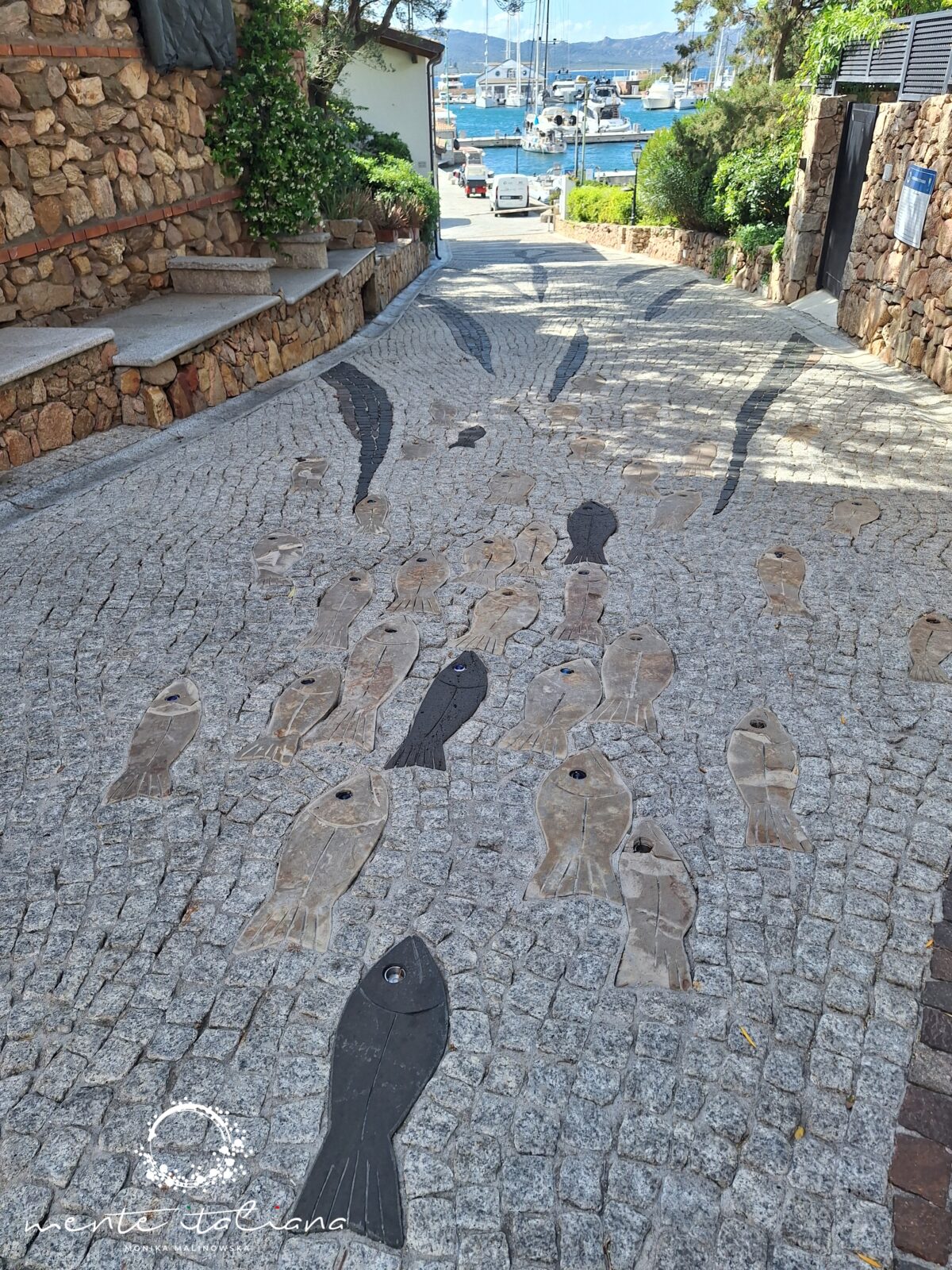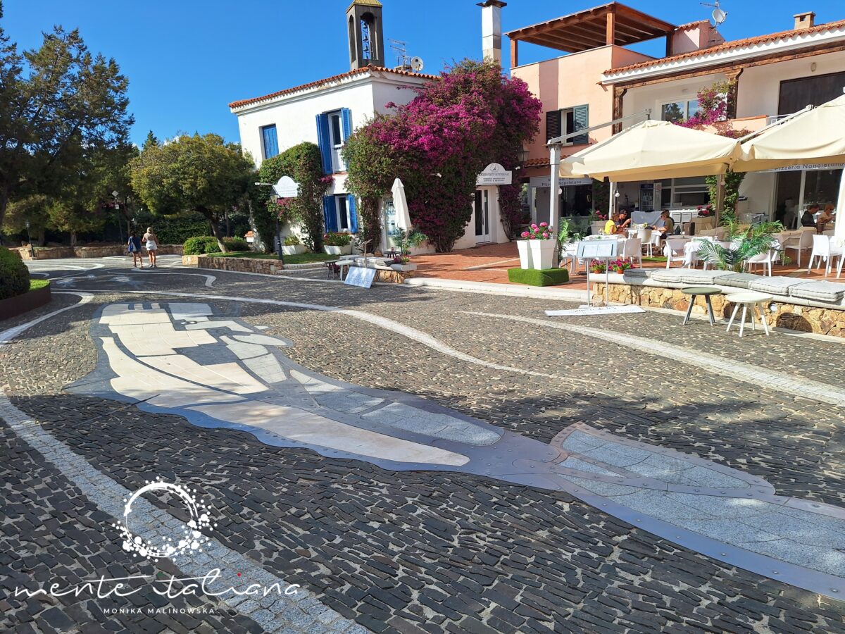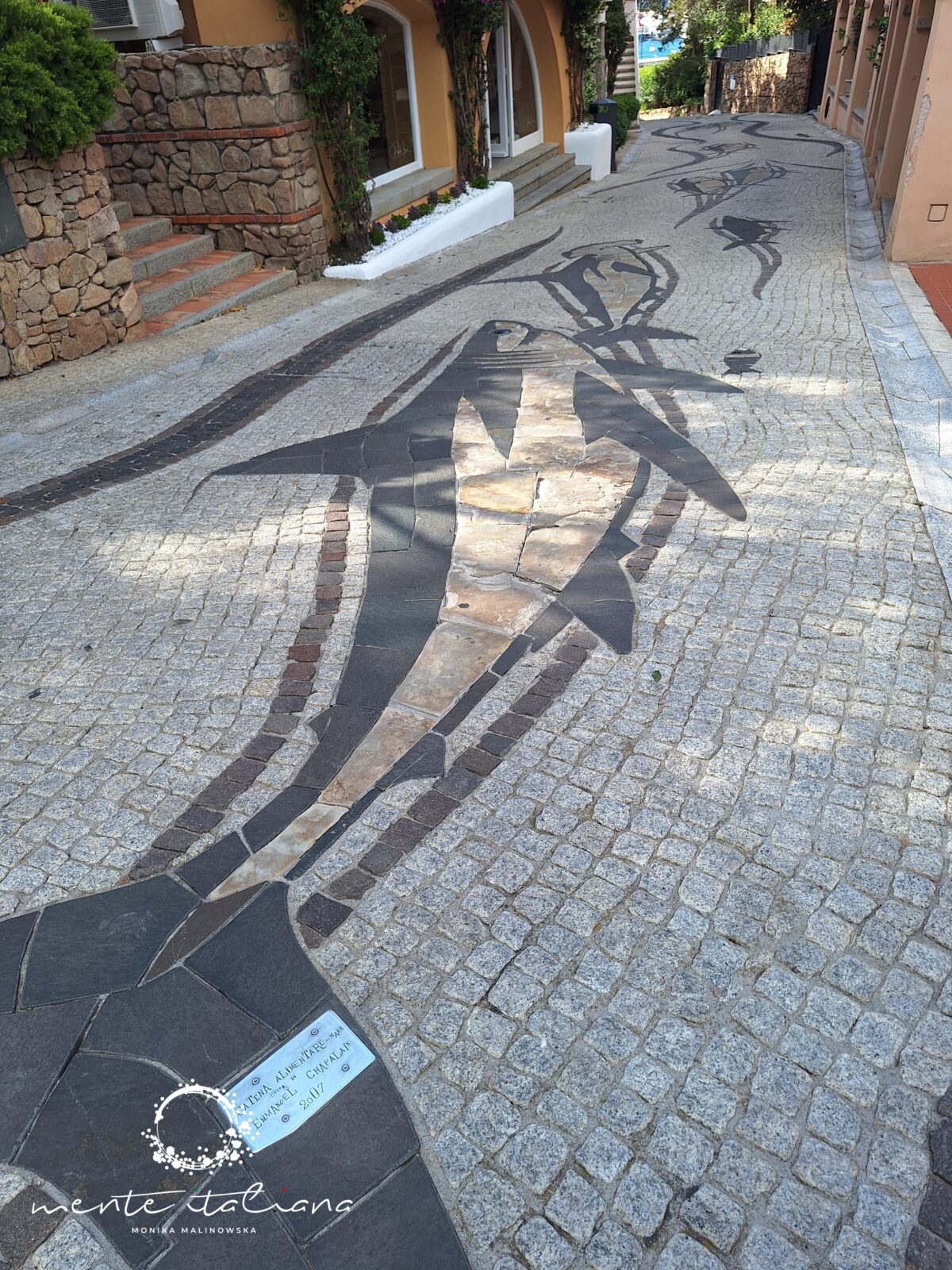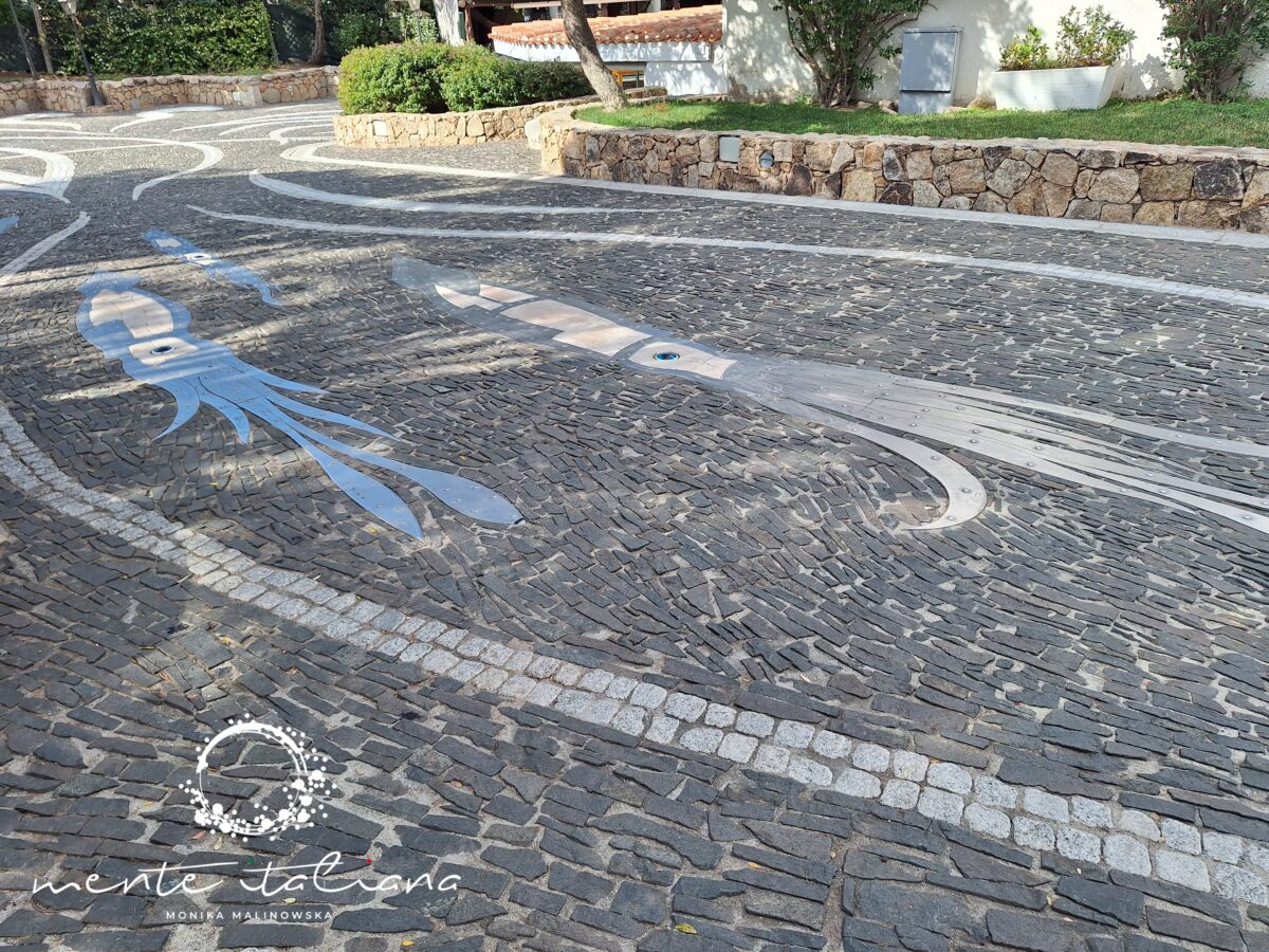 W tym podkreślam mało realnym dla mnie świecie odnalazłam piękno natury, niesamowitą moc ludzkich marzeń, a także sztukę.  Sztukę niepozorną, nienachalną, dyskretną. Sztukę, która mnie zachwyciła. Spacerując wystarczyło patrzeć pod nogi. Spacerowałam po dziele sztuki niezwykłej urody! W Porto Rotondo, z placu Piazza Quadra do portu poprowadzi droga wyjątkowa. Na via del Molo znajduje się dzieło sztuki stworzone przez artystę Emmanuela Chapalaina. Przedstawia ono morski łańcuch pokarmowy. Zobaczymy tu wieloryba, rybę młota, miecznika, ośmiornicę, sardynki i inne stworzenia morskie. Catena Alimentare del Mare to przepiękna i bardzo oryginalna mozaika wykonana w całości z naturalnych, pochodzących z wyspy materiałów takich jak surowy granit, żółty piaskowiec, czerwony porfir, szary bazalt, marmur. Wieczorową porą rybom świecą oczy!! Do ich wykonania wykorzystano szkło z Murano.
