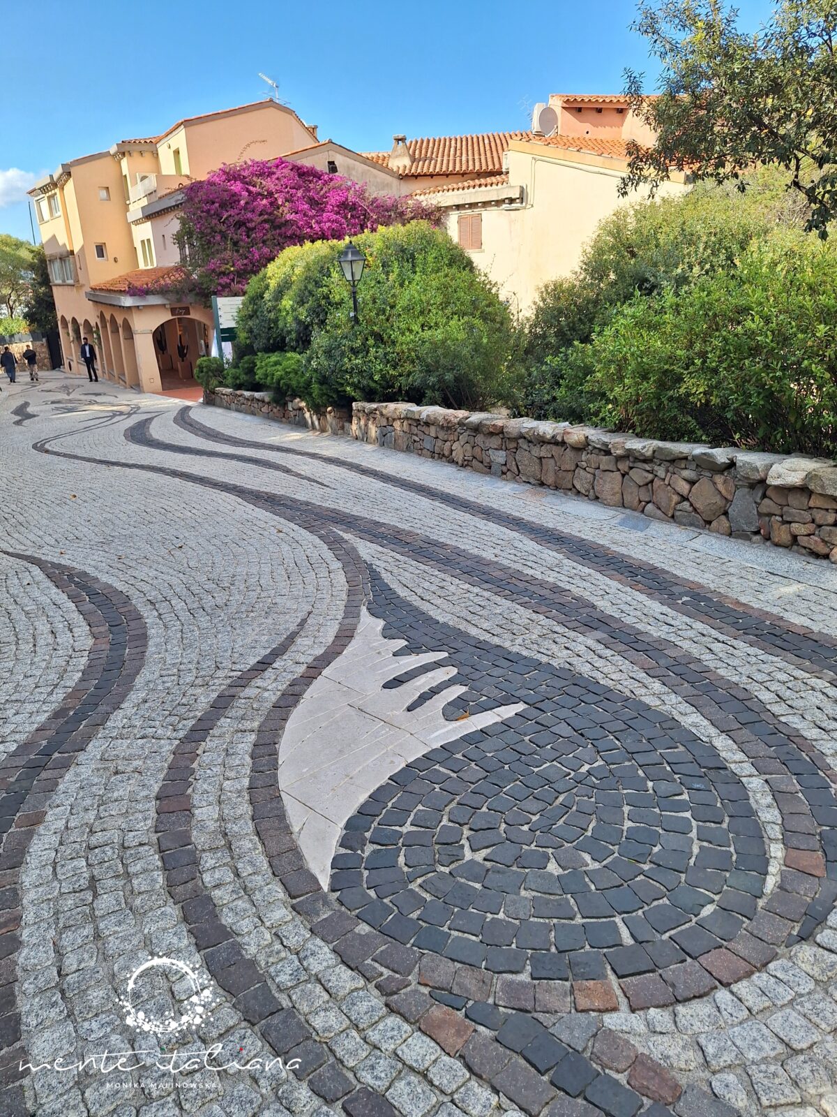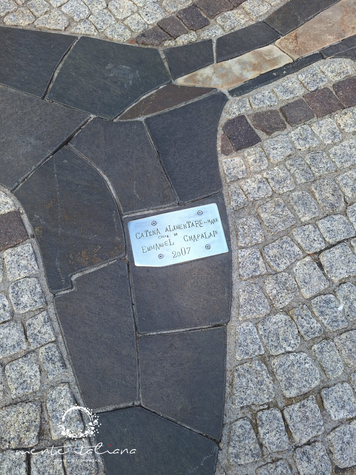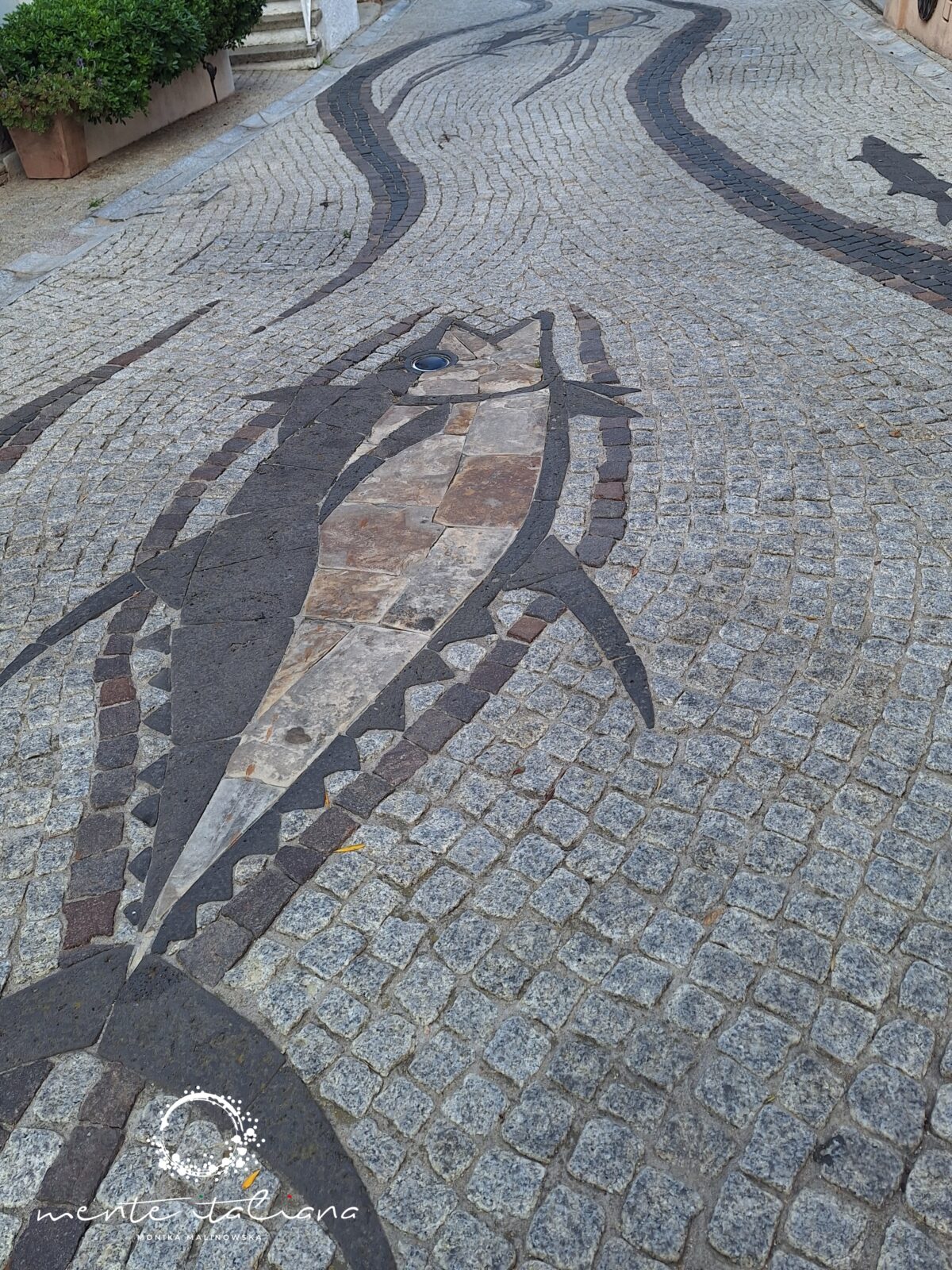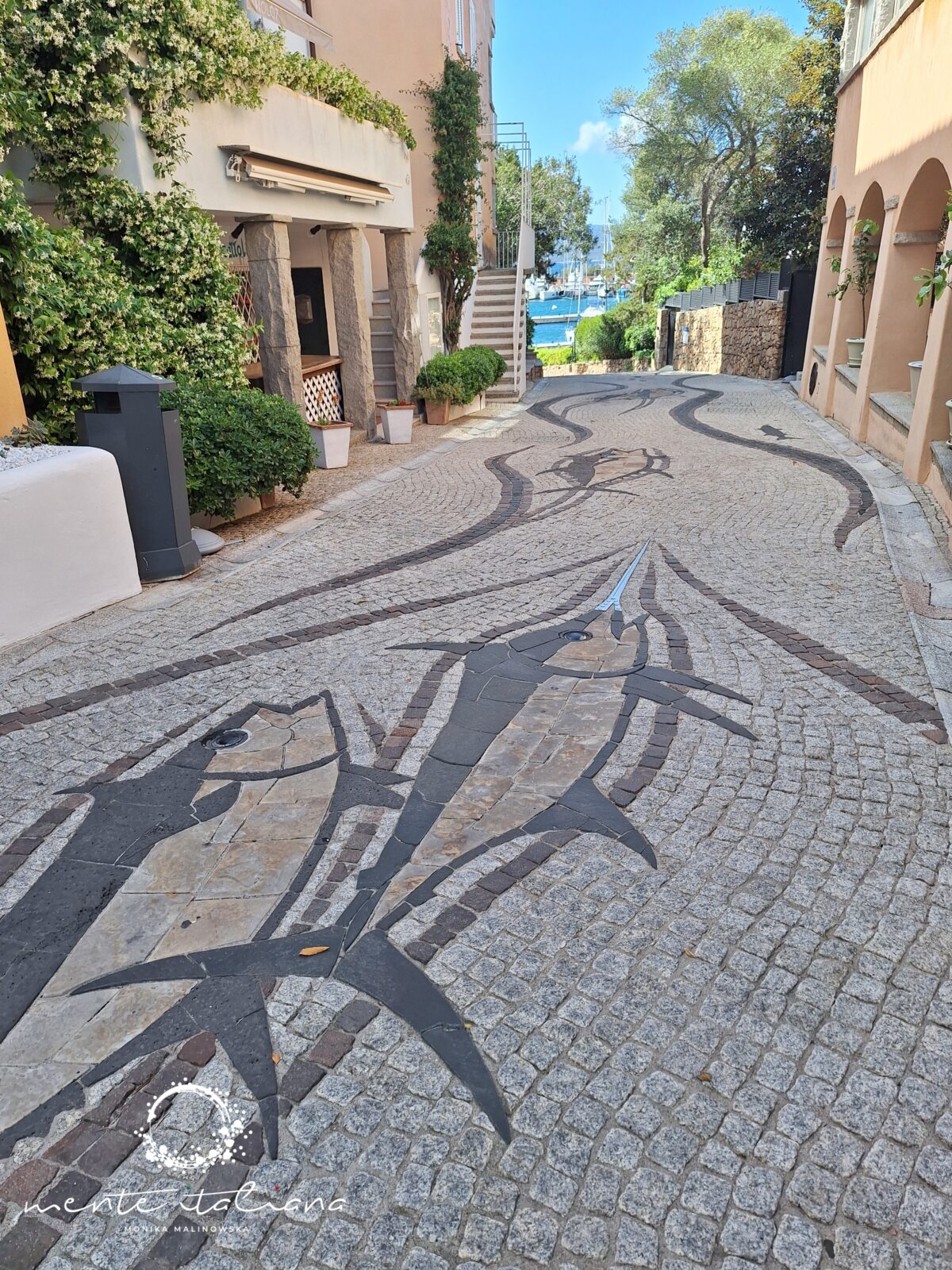 W tym podkreślam mało realnym dla mnie świecie odnalazłam piękno natury, niesamowitą moc ludzkich marzeń, a także sztukę.  Sztukę niepozorną, nienachalną, dyskretną. Sztukę, która mnie zachwyciła. Spacerując wystarczyło patrzeć pod nogi. Spacerowałam po dziele sztuki niezwykłej urody! W Porto Rotondo, z placu Piazza Quadra do portu poprowadzi droga wyjątkowa. Na via del Molo znajduje się dzieło sztuki stworzone przez artystę Emmanuela Chapalaina. Przedstawia ono morski łańcuch pokarmowy. Zobaczymy tu wieloryba, rybę młota, miecznika, ośmiornicę, sardynki i inne stworzenia morskie. Catena Alimentare del Mare to przepiękna i bardzo oryginalna mozaika wykonana w całości z naturalnych, pochodzących z wyspy materiałów takich jak surowy granit, żółty piaskowiec, czerwony porfir, szary bazalt, marmur. Wieczorową porą rybom świecą oczy!! Do ich wykonania wykorzystano szkło z Murano.
